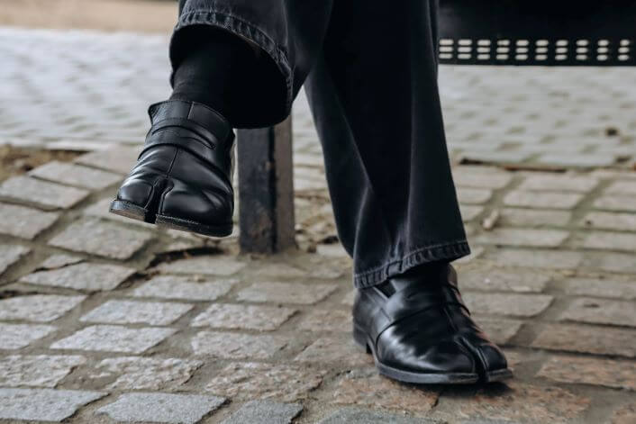 Tabi shoes are a type of traditional Japanese footwear inspired by the tabi sock, which separates the big toe from the other toes. Many tabi shoes are flat or have minimal heels and can be made from different kinds of materials, whether that be cloth, leather, or modern synthetics.