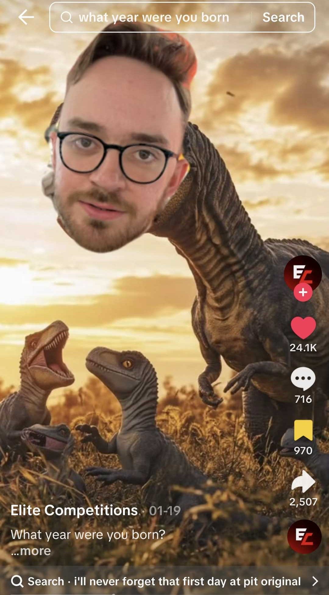 This is something the “what year were you born?” trend exploits. The cameraperson walks around a business’s premises (such as a cafe, bookstore, or office) and asks certain team members what year they were born. The first two or three people say a year from the 2000s, but once an older member utters “19”, the video cuts off to a photo of a dinosaur with the member’s face on it, or a photo from another ancient period.